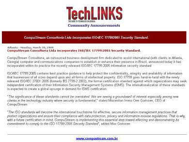 Atlanta – Monday, March 20, 2006 – CompuStream Consultoria, an outsourced business development firm dedicated to assist international (with clients in Atlanta, Georgia) computer and communications companies to establish or enhance their presence in Brazil, announced today it has incorporated within its practice the recently released ISO/IEC 17799:2005 information security standard.