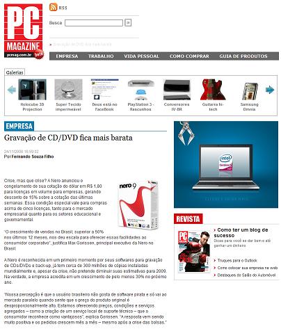 A Nero é reconhecida em um primeiro momento por seus softwares para gravação de CDs/DVDs e back-up, já tem cerca de 300 milhões de cópias instaladas mundialmente e, apesar da crise, não pretende diminuir suas estimativas para 2009. Na verdade, a empresa acredita em um crescimento de pelo menos 30% no próximo ano.