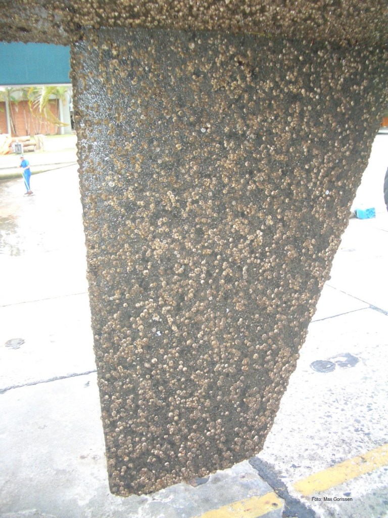 Na foto, cracas e mariscos que grudam no casco, leme e na quilha, são uma “praga” constante para os velejadores de oceano.