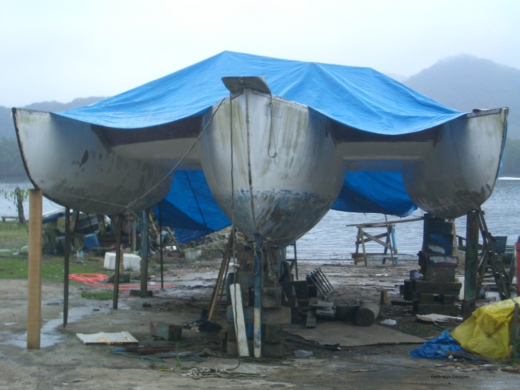 Trimarã de madeira de aprox. 36 pés sendo reformado. O nome no casco é Bomaimalu. Canal de Bertioga – Guarujá – SP.