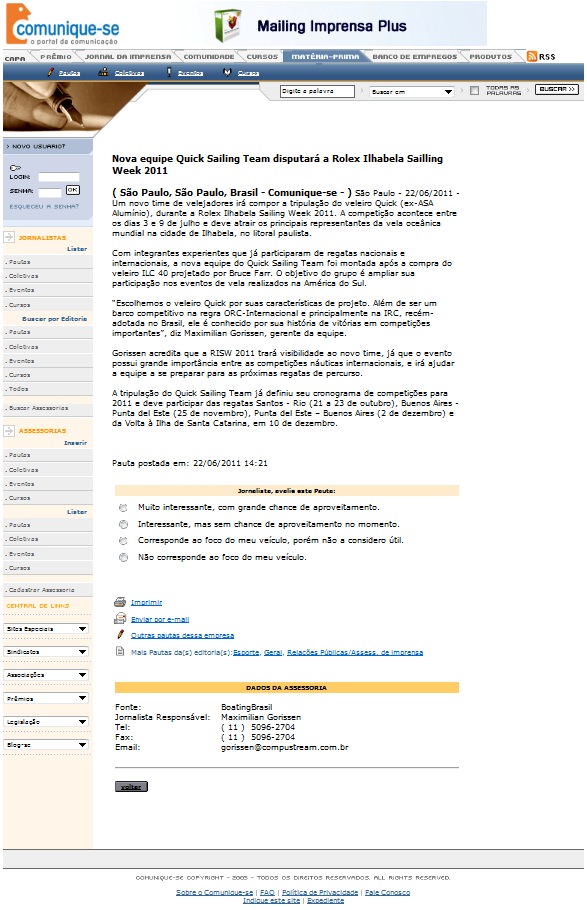 Comunique-se – São Paulo – 22/06/2011 – Um novo time de velejadores irá compor a tripulação do veleiro Quick (ex-ASA Alumínio), durante a Rolex Ilhabela Sailing Week 2011. A competição acontece entre os dias 3 e 9 de julho e deve atrair os principais representantes da vela oceânica mundial na cidade de Ilhabela, no litoral paulista.