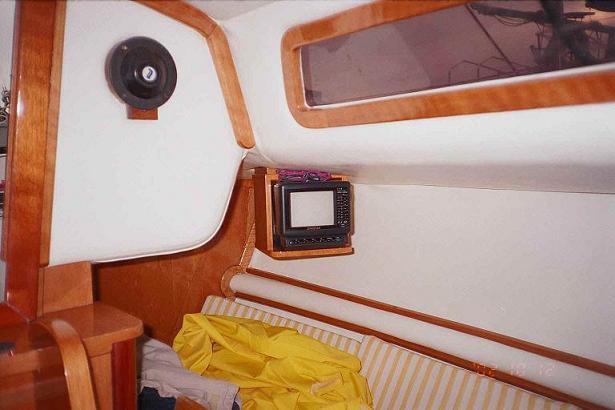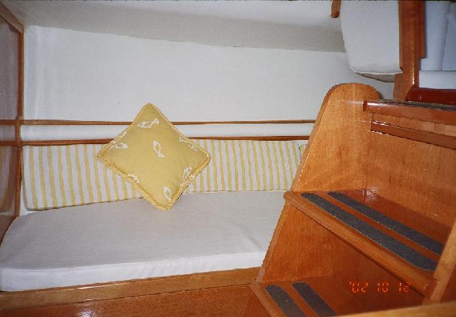 Tudo é construído em compensado naval laminado em madeira clara e de boa qualidade. Para melhorar a aparência do veleiro, todo o seu teto foi revestido com um material de couro sintético branco e acabamento esmerado em madeira envernizada, eliminando todas as imperfeições originais (a embarcação saía do estaleiro com o teto em fibra de vidro e todos os parafusos passantes à mostra), o que dá ao interior um aspecto muito limpo e agradável.