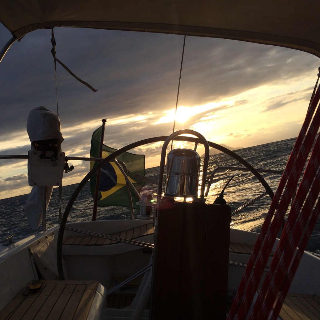 Da esquerda para a direita: 11 nós de vento e 7 nós de velocidade. Em algum lugar entre Guarujá e a Ilha de Alcatrazes. A bandeira brasileira se agita feliz à popa.
