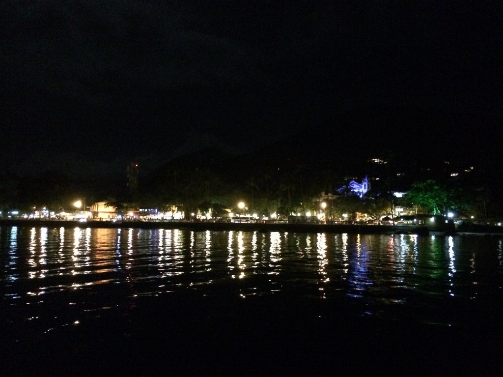 Como sempre, a motorada noturna entre Toque-Toque e o centro de Ilhabela é muito maçante, principalmente se não aparece nenhum navio para quebrar a monotonia: é só luz brilhando dos dois lados do canal, e o barulho incômodo do motor em alta rotação.