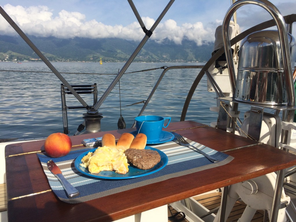 Após circundar o veleiro confirmando que tudo estava bem e enrolar mais um tempo antes de sair da água, a fome bateu, e finalmente saí da água para tomar meu café da manhã. Desta vez, não tinha café, mas chá preto… e ovos… e uma fatia de hambúrguer de picanha… e três bisnaguinhas com queijo fundido… e, saudável, um delicioso pêssego gelado, que passara a noite na geladeira.