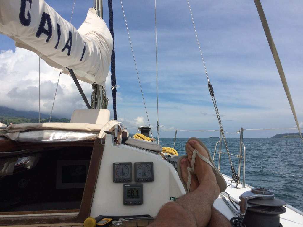Aproveitei o tempo para relaxar, apreciar a inebriante natureza na qual estava inserido, observar o voo dos pássaros e suas investidas no mar para pegar peixes, o céu azul ensolarado, e apreciar o conforto que um veleiro de 40 pés nos oferece.