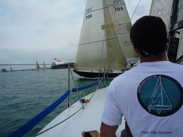 Chegamos na raia 1 minuto depois da nossa largada, ou seja, largamos em último, no meio da largada dos RGS-Cruiser. Não importa, estávamos na regata. Agora, era recuperar a distância e as posições e, para isso, caçamos mais ainda, contudo, o excesso de vela não se transformava em velocidade e sim em adernada e, com o barco em um ângulo de 240º graus, cortando as ondas que passavam por cima do deck, com toda a tripulação na borda e a mestra planejando para tirar um pouco a potência, fomos diminuindo a distância dos outros barcos que velejavam mais “ajuizados”.