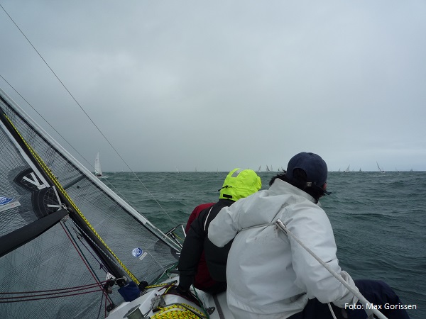 Saímos velejando rápido com o vento no través e, ao chegar na raia, percebemos que, devido à neblina, havíamos confundido a raia e estávamos na raia dos HPE e Star. Tentamos achar a outra raia na neblina e encontramos algumas velas no horizonte. O Fabrizio estava no leme no momento e, caçando a mestra, começamos uma orça com mar grande pela proa. Tínhamos a vantagem de nossa largada ser a terceira (C3), contudo, tínhamos uns 15 minutos para chegar na raia.