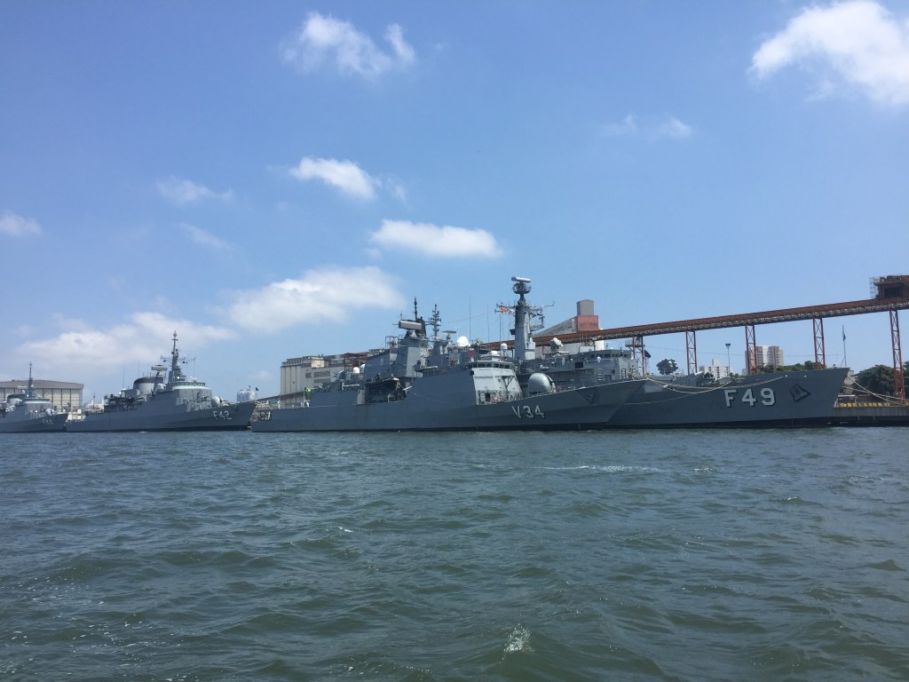 Os navios da marinha quebram a monotonia do passeio: era dia de visita e os marinheiros estavam vestidos com seus belos e elegantes uniformes brancos.