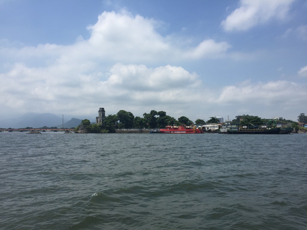 Tudo está errado nesta orla… Observe o prédio à direita da igreja: quem, em sã consciência, constrói um prédio sem janelas e sem vista para o canal e a Mata Atlântica do outro lado? Os galpões velhos (seriam antigos, se estivessem restaurados) dão uma sensação de decadência e desleixo.