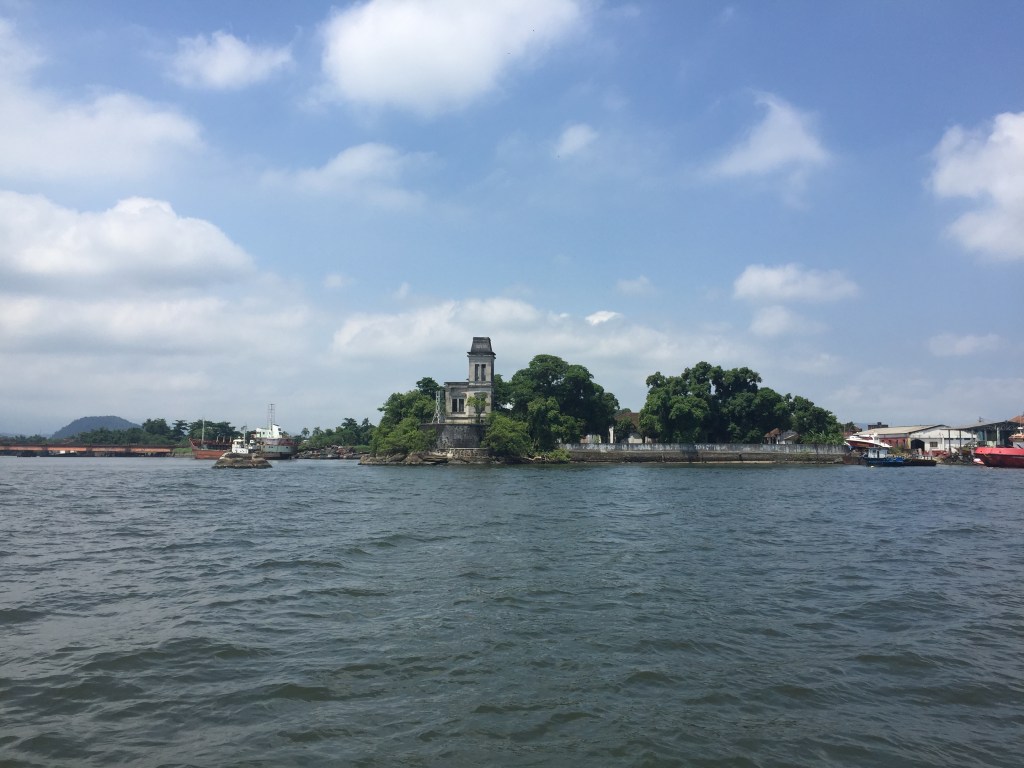 Este barco de pesca, rodeado por boias de contenção para o caso de vazamento, apodrece em frente ao que acredito ter sido um prédio de escritório de estilo colonial, hoje em ruínas.