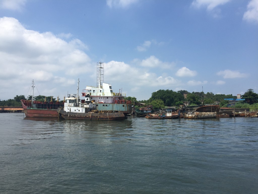 Um dos diversos estaleiros com navios enferrujados. Este parece que foi adaptado como barcaça de dragagem do canal. Incrível como ainda flutua! Ou será que não flutua mais, e é por isso que estava ali?