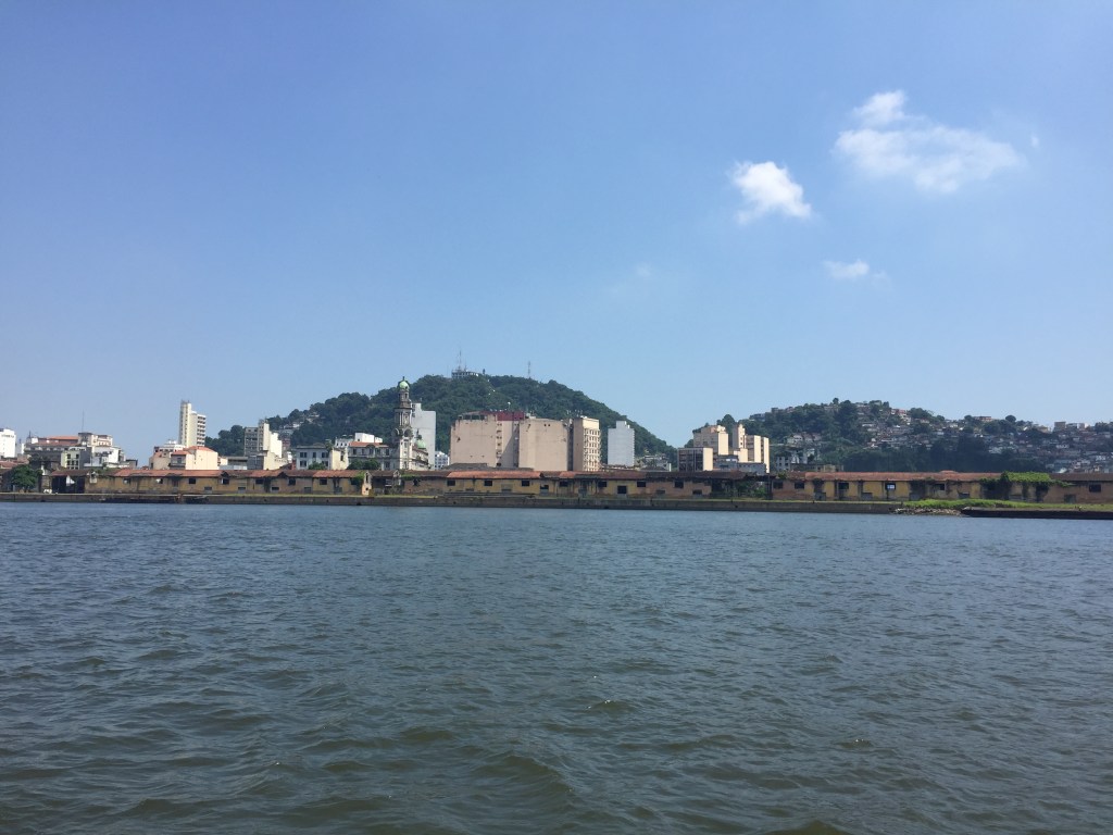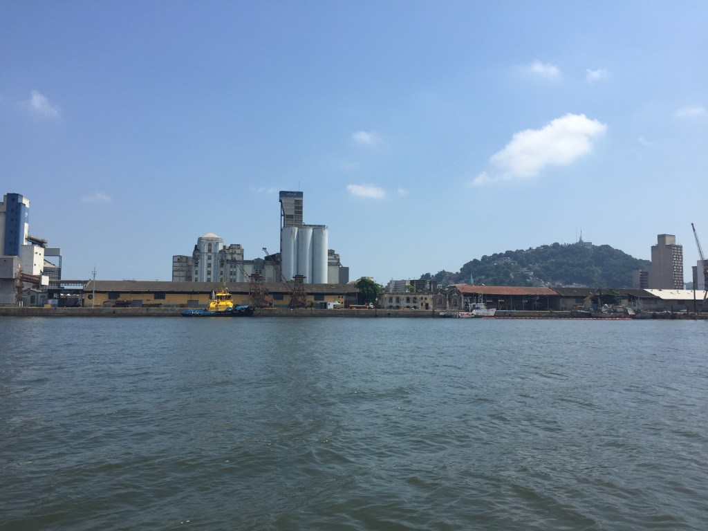 Decidi seguir um pouco mais adiante para visitar a velha cidade de Santos (atual Centro Histórico de Santos), mas não há lugar para atracar uma embarcação de lazer para fazer turismo na cidade: toda a extensão do cais está fechada por galpões, entulho e muito lixo… Lembrei imediatamente do livro de Élio Somaschini, O que sobra de uma viagem: histórias de um velejador em solitário, no qual ele diz que “chegar em uma cidade de veleiro é entrar pela porta da frente, é descobri-la na sua forma mais bela, é ver a cidade sorrindo e convidando”… Bem, no caso da Vila e Centro Histórico de Santos, chegar de veleiro é chegar pela porta dos fundos, e a porta, além de suja e mal cuidada, está fechada! Não há onde atracar! Que pena… Quanta falta de visão das instituições públicas… Depois reclamam que não existe turismo e cultura no Brasil.