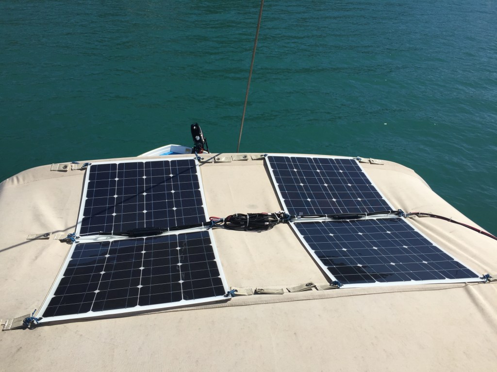 Instalei painéis solares pois acho que são fundamentais para manter a energia das baterias, sem ter de usar constantemente o motor, durante uma navegação longa. Em vez de dois painéis de 100 V usei 4 painéis de 50 V. A ideia por trás desta decisão é simples. Se um painel solar por algum motivo quebrar, perco somente 50 V e não 100 V.
