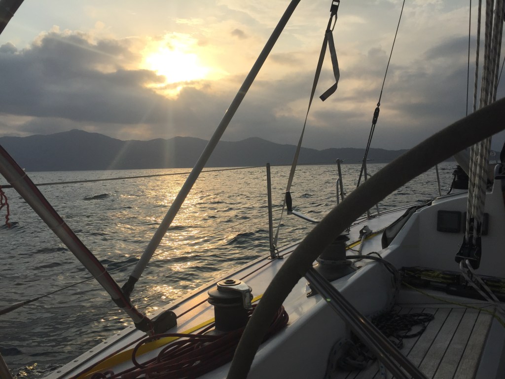 Cacei a genoa para evitar de panejar a valuma, e continuei observando o pedaço e o rasgo na genoa. Tudo “calmo” na velejada rápida, decidi por iniciar uma série de “sonecas” para não estar tão cansado à noite. A ideia era fazer 45 minutos de soneca a cada 3 horas acordado. Então, coloquei o timer (de cozinha) que trouxe com 45 minutos, peguei o chapéu para cobrir o rosto e tentei cochilar nesse movimento do veleiro. Acho que até peguei no sono, contudo um barulho de vela forte me acordou. O vento havia rondado ou o veleiro havia saído do curso – e não é que o vento rondou mesmo!