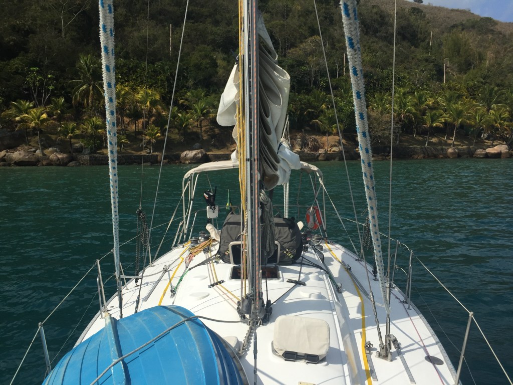 Tive uma noite muito ruim. Não por causa do mar, que estava um “espelho”, sereno, mas por causa da minha própria cabeça. A principal preocupação era o ferro garrar (se soltar) e o veleiro ir parar nas pedras. A cada solavanco causado por mudança de maré, onda ou vento, eu acordava e levantava da cama de proa onde estava dormindo e corria para abrir a gaiuta, para ver se o veleiro estava no mesmo lugar em relação aos pontos em terra que eu havia definido ao jogar o ferro. Uma insegurança típica de início de viagem. Por esse motivo, dormi muito pouco e com um sono “quebrado”, cheio de sonhos malucos. Acabei dormindo um pouco mais do que previa, acordando às 8h com um dia maravilhoso e águas convidativas para um banho.