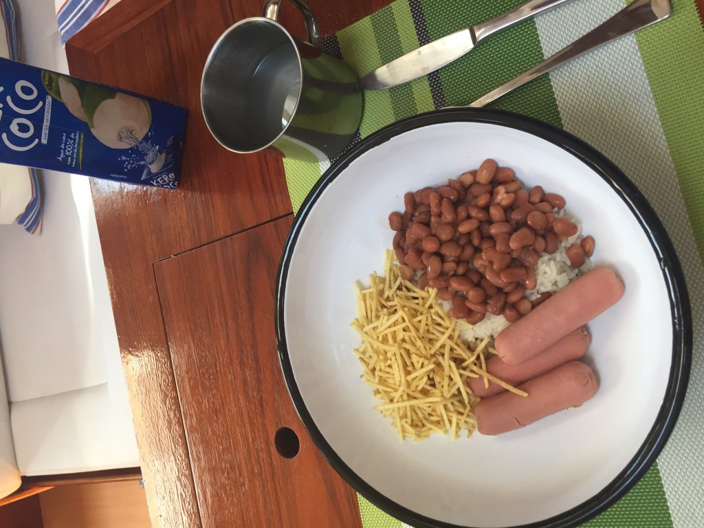 Além do clássico macarrão, levei muita comida enlatada (dentro do prazo de validade) … sei que não é o mais saudável, contudo, é muito prático pois apenas precisa aquecer… na foto: salsichas em lata, arroz de saquinho e feijão de caixa (1 porção) com batata palha e água de coco… pelo menos não passo fome e tenho a certeza de que estou alimentado!