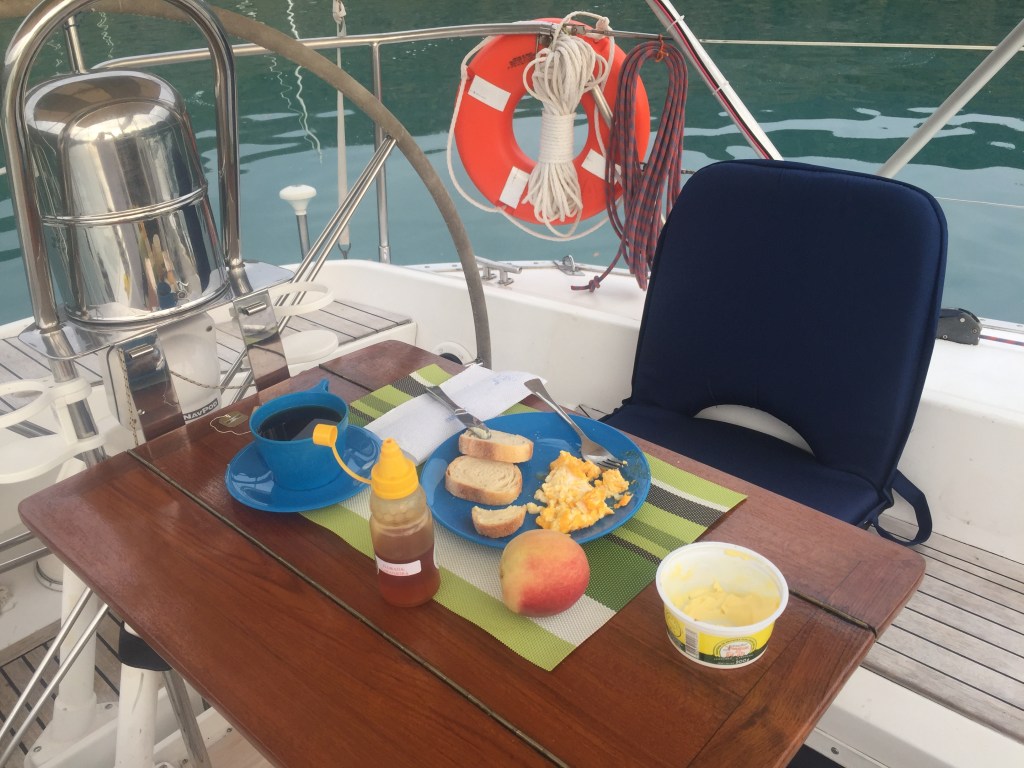 Eram dez e meia de uma manhã tranquila de domingo no Saco da Ribeira, em Ubatuba. Minha esposa Zabetta, meu filho Maximilian e eu tomamos café da manhã juntos no cockpit. Um momento descontraído em família, embora já saudoso.