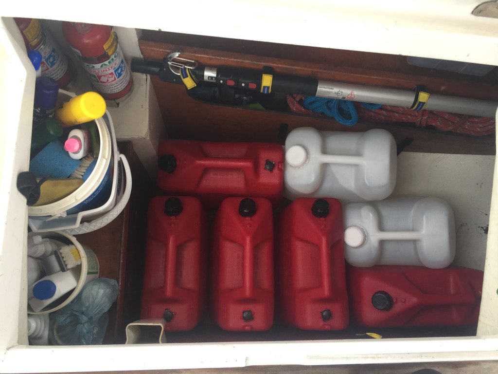 Galões de 25 l de diesel (vermelhos) e 20 l de água (brancos) organizados no paiol de popa. Por cima vão as defensas e um botijão de gás. Tudo organizado e fora da vista, que é como gosto.