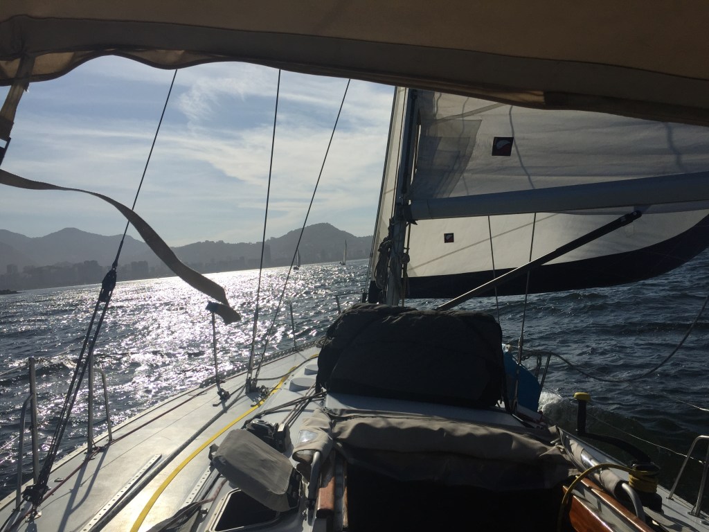 Mudei o rumo, defini o curso no GPS, que apontava 4,5 horas para a entrada da Baía de Guanabara, e parti com um vento em “popa rasa”, com 15 a 20 nós de vento na rajada, acertando o rumo para evitar um jibe da mestra, que poderia, com esse vento, danificar minha mastreação. Houve um momento em que precisei fazer o jibe, que saiu meio rápido demais, porém sem maiores consequências.