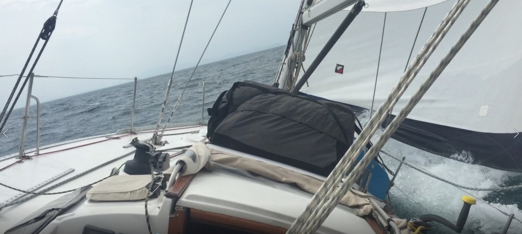 Então, tudo ficou nublado… visibilidade quase zero… e o veleiro andando rápido empopado, com ondas também pela popa, que me faziam “surfar” e ter de ajustar e cuidar do rumo para evitar um jibe chinês.