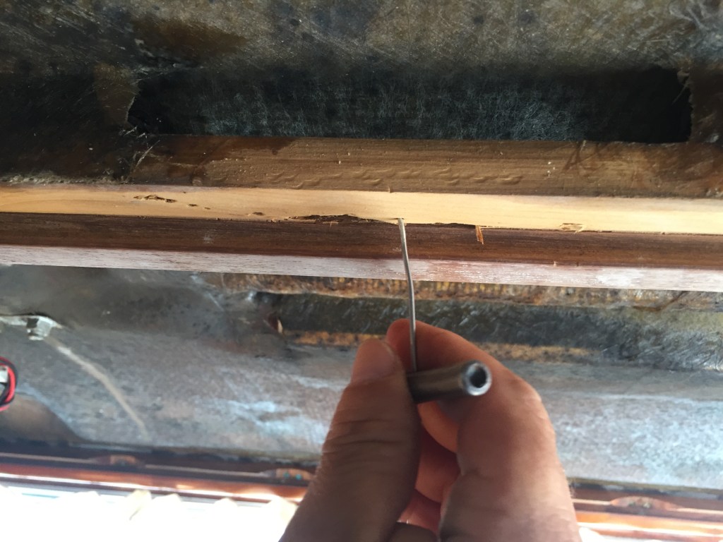 Na sequencia acima, do topo esquerdo no sentido horário: A asinha da revoada, note o colorido típico do cupim Cryptotermes Brevis alados; Fezes do cupim, se encotrar isso no seu veleiro chame a dedetizadora!; Trabalho de pasciência abrindo os buracos e batendo na madeira para retirar as fezes; Aplicação do produto. Por sorte, o cupim estava apenas em três madeiras de sustentação do forro do teto e não nas anteparas.