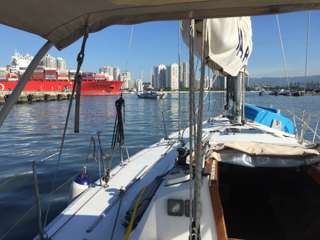 Acordei no dia 9 de janeiro às 6 h, pois nesse horário a maré estava em seu ponto mais alto, o que deveria me garantir uns 4 metros de profundidade na barra do canal. Também queria chegar ao Guarujá naquele mesmo dia, e calculei umas 17 horas de viagem, pois, se não ventasse, eu usaria o motor para tentar manter a velocidade de 7 a 8 nós de cruzeiro.