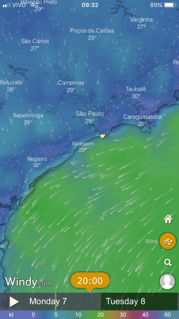 Partindo com a ponta da praia de Santos ao fundo… nada de vento! Mas a previsão de vento no trajeto era boa…
