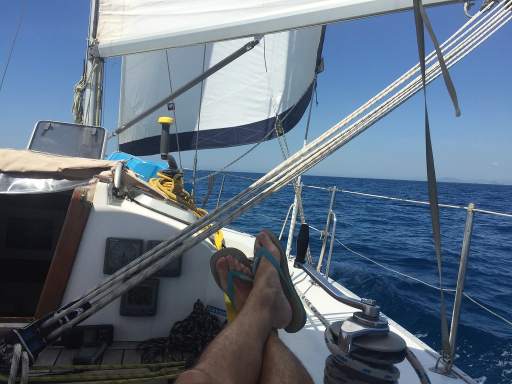 Você já deve conhecer a sensação: o vento enche as velas e empurra o veleiro a uma velocidade de 5 a 6 nós. Sentado, olhando para a proa, com o corpo totalmente relaxado e as pernas esticadas e um pouco elevadas apoiadas na proteção do cockpit, você se concentra no balanço do mar, olhando as marolas. Nos pés, as sandálias de borracha dão o tom do momento, criando uma imagem de relaxamento e descanso. O silêncio do mar, quebrado somente pelo barulho da água sendo deslocada pelo casco, num chuaaaaá inebriante, e, eventualmente, um tong seco de algum cabo batendo no metal da mastreação quando entra uma rajada. Você está em transe, mas atento ao movimento do veleiro, que, suavemente, aderna e volta, aderna e volta, em um movimento constante gerado pelas marolas que levantam o casco e pelo vento que estufa as velas.