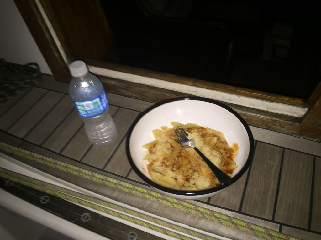 Preparei um pene ao molho de tomate com cebolas e queijo ralado. O veleiro balançava muito, então tive de colocar o mínimo de água para ferver a massa, pois o fogão articulado ia de um lado para o outro. O molho, apesar de pronto, gosto de incrementar com cebola. Primeiro corto em pedaços pequenos e frito meia cebola no azeite e, quando estão dourados, coloco meio saquinho de molho pronto, um belo pedaço de manteiga e mexo até tudo ficar aquecido (não ferver). Então pego um prato fundo de metal que guardo para momentos de mar agitado, ponho a massa já escorrida e jogo por cima o molho de tomate e o queijo ralado. Fica delicioso! Uma fatia de pão e uma garrafa de água (vinho seria o ideal, porém nunca bebo álcool quando velejo) complementam o jantar simples… À noitinha, depois de um dia de velejada, uma comida quente – não tem nada melhor!