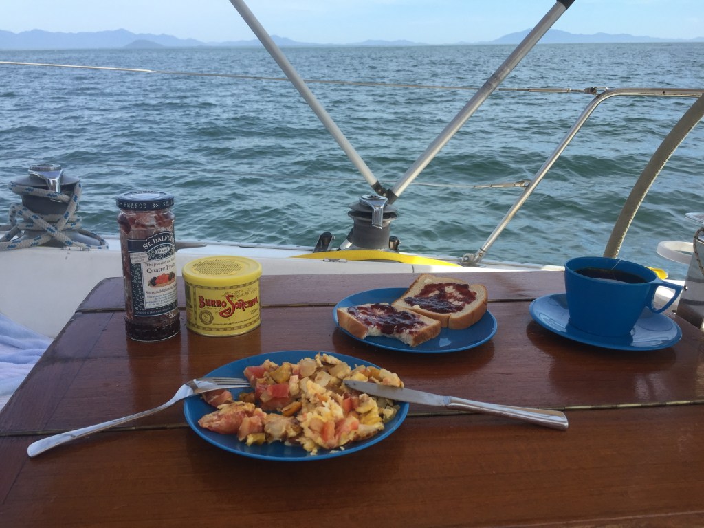 Fiz um sanduíche de pão de forma com manteiga e geleia e, com o motor já ligado, depois da primeira mordida no sanduíche, fui até a proa para levantar a âncora. Não houve estresse: as águas do canal estavam paradas, como um espelho refletindo as cores da manhã.