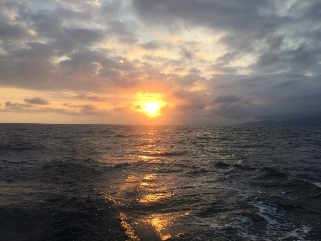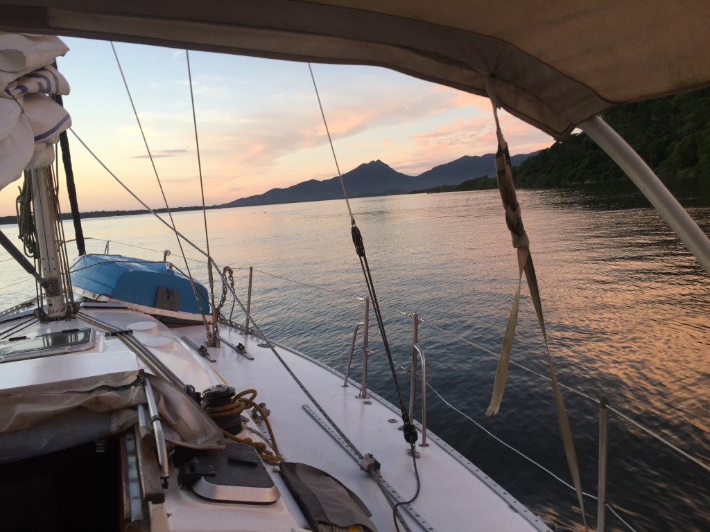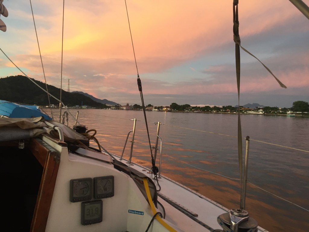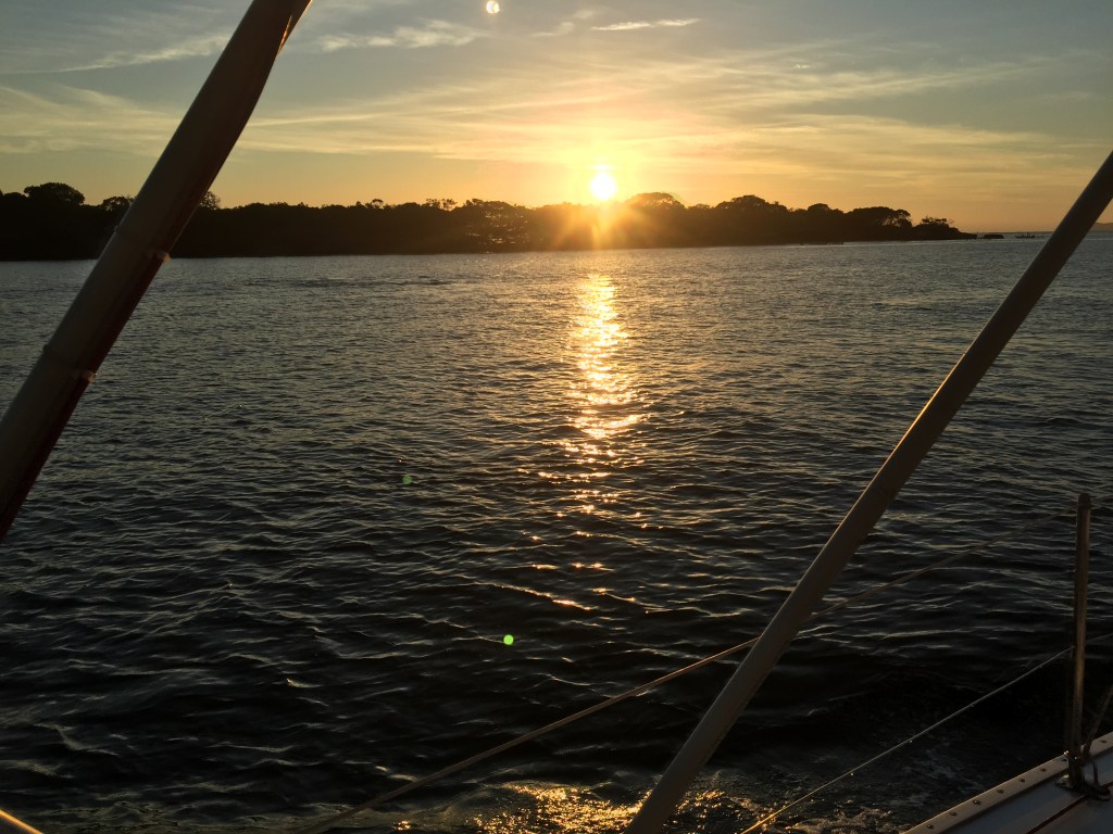 Ancorado na Ilha do Bom Abrigo com o sol nascendo por trás da ponta sul da ilha. Vou dormir…