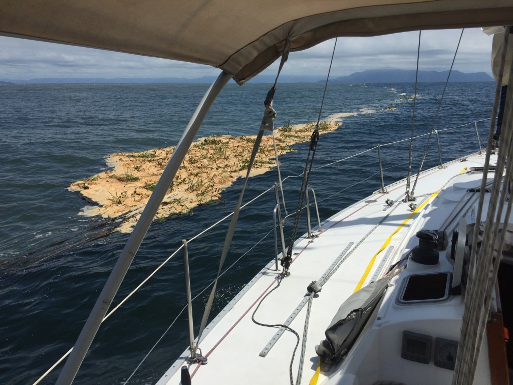 Terminei então de tirar a água do porão e fui esfriar o sangue descansando no deck por meia hora – o que, com o calor que fazia, não adiantou muito. Mas logo tive de me movimentar novamente, para levantar ferro e achar outro fundeadouro: começava a ventar forte, 14 nós com 16 nós na rajada, e fiquei preocupado pois fortes marolas e correnteza indicavam que a maré estava subindo. Tive até a sensação de que o veleiro tinha unhado (se soltado) e estava derivando, mas nunca saberei com certeza, pois segundos depois já estava levantando o ferro.