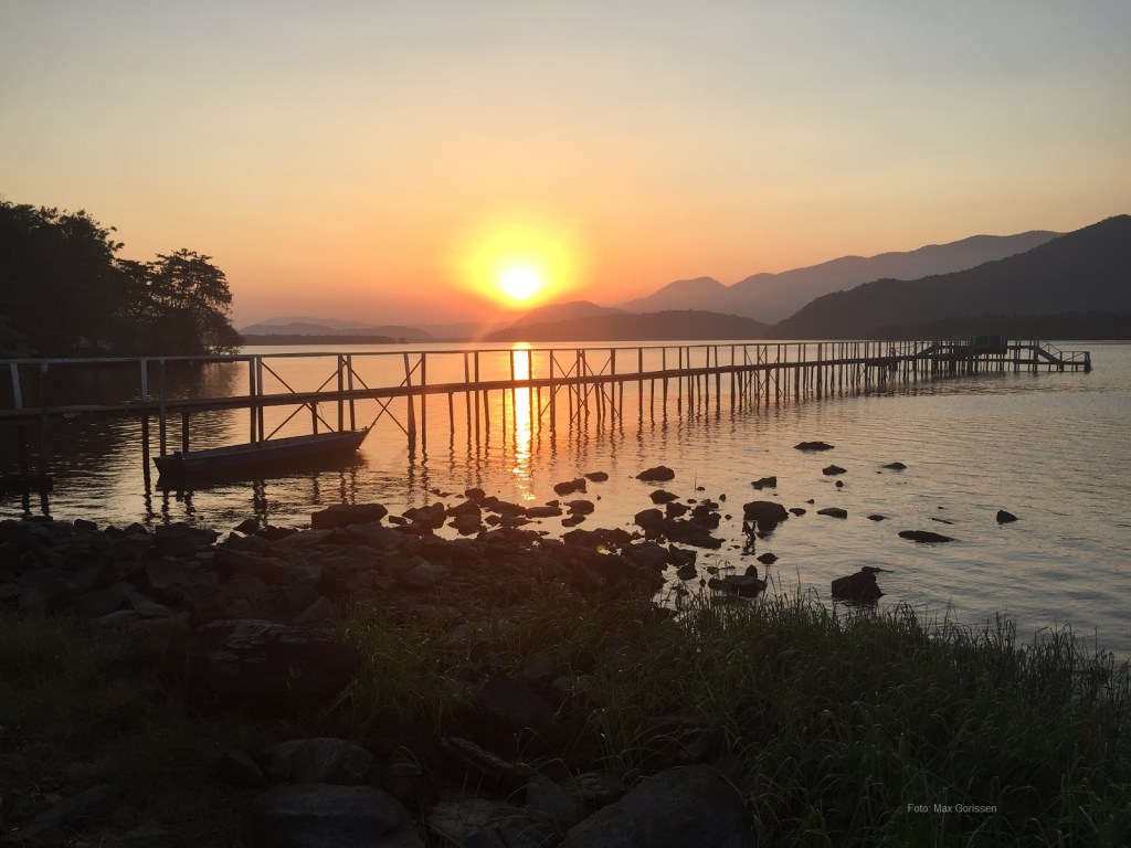 Este maravilhoso pôr do sol de “inverno brasileiro” no canal de Bertioga, com a serra do mar como pano de fundo, nem precisava do trapiche e da canoa em primeiro plano para ser perfeita…, mas que deram um toque bucólico à foto, isso deram…