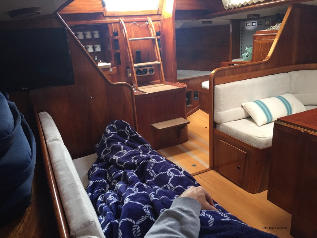 Tirando uma “soneca” todo coberto durante um “raro” dia de frio deste inverno brasileiro. É fácil relaxar e cair no sono deitado no sofá desta aconchegante cabine do veleiro.