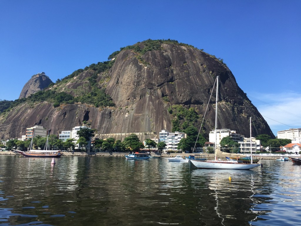 A beleza do Pão de Açúcar visto da baía realçada com as embarcações apoitadas na sua margem.