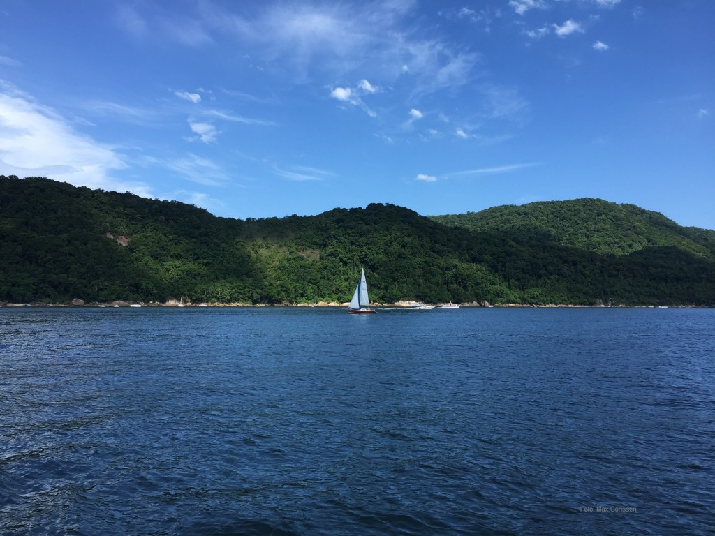 Veleiro navega tranquilo pela costa do Guarujá – SP.