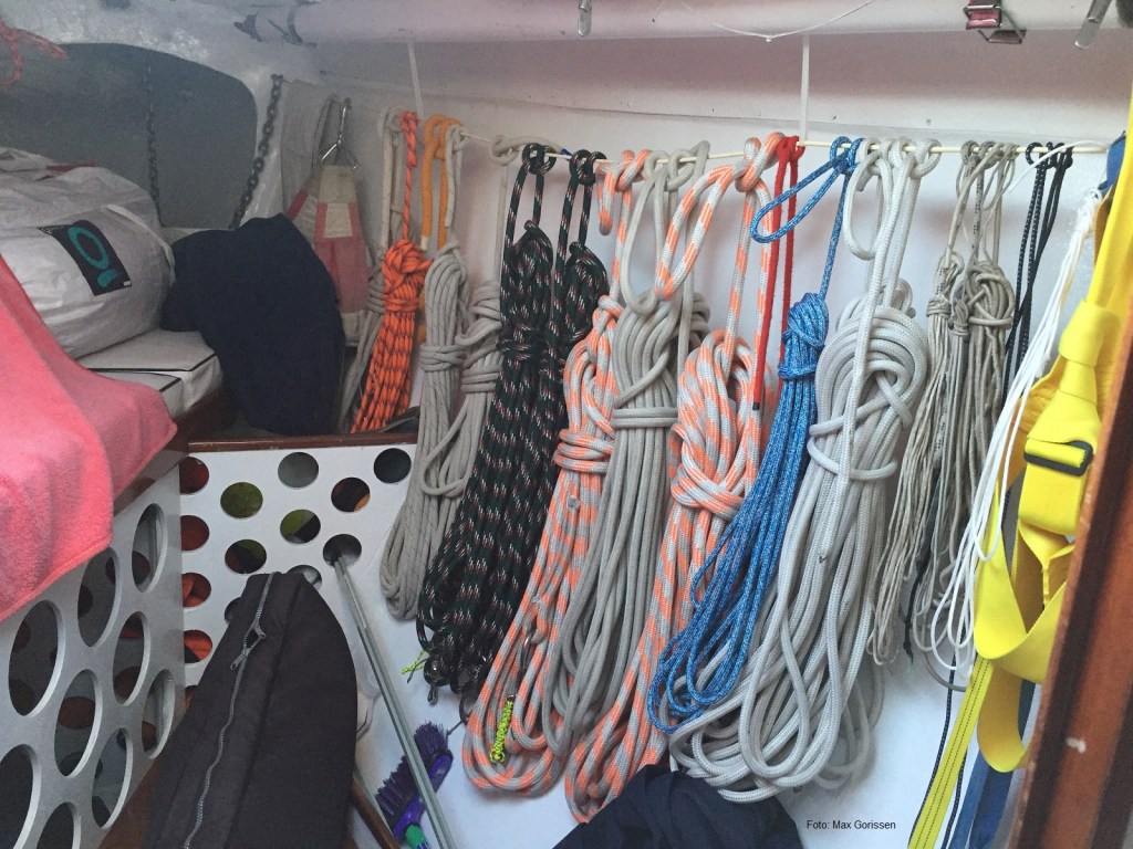 Proa do veleiro Vendetta onde se armazenam as velas e os cabos. Repare nas anteparas furadas para diminuir o peso.