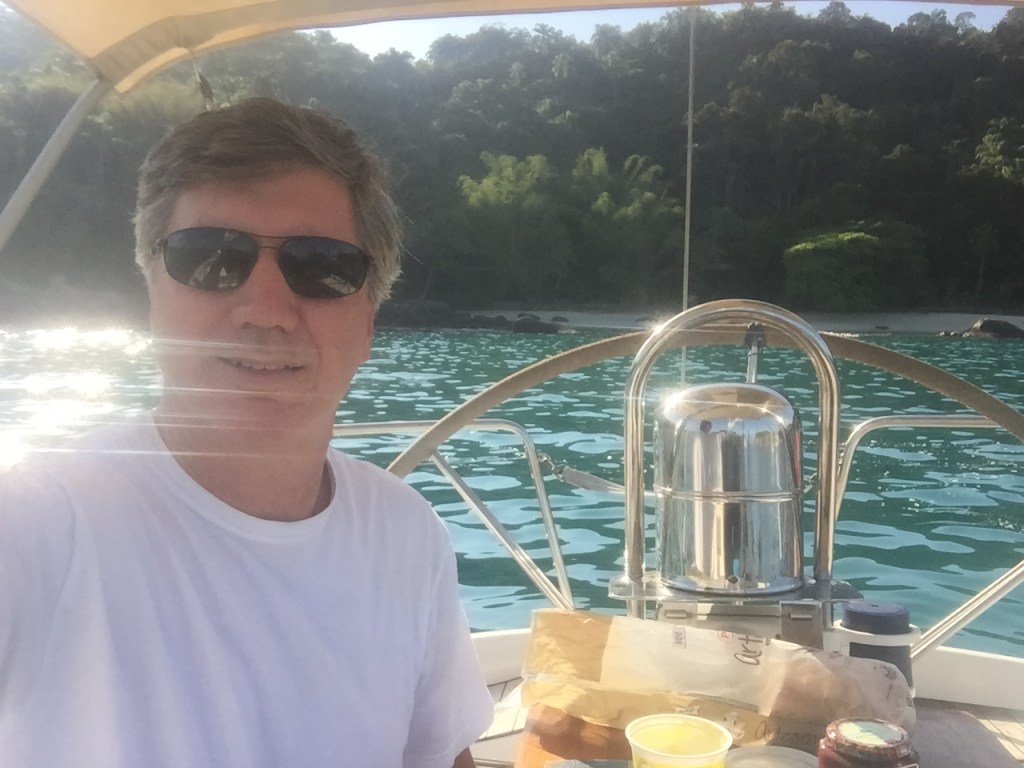 A fome bateu e fiz meu tradicional chá da manhã, que devorei na mesa montada no cockpit, aproveitando o dia ensolarado, mas ainda fresco, e a vista das duas praias maravilhosas chamadas de Praia da Terra (ou das Couves), com cerca de 100 metros, e a Praia de Fora (ou do Japonês), maior que a primeira, com cerca de 250 metros.