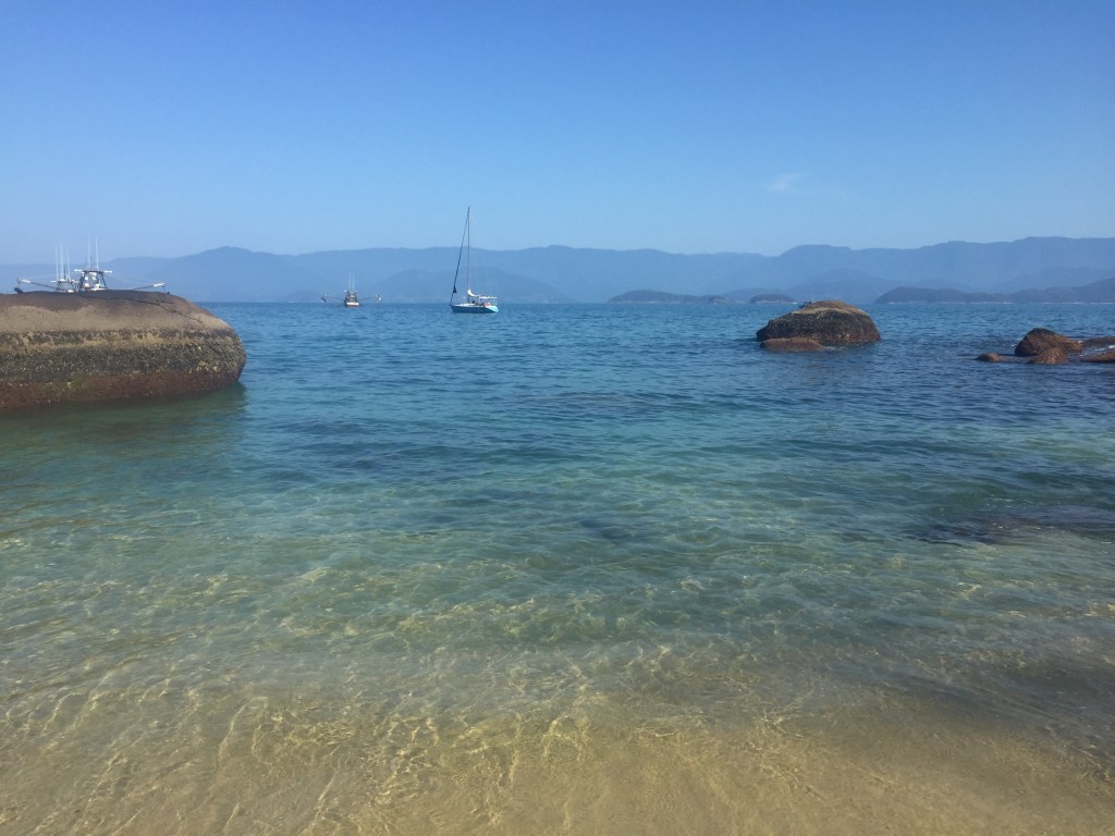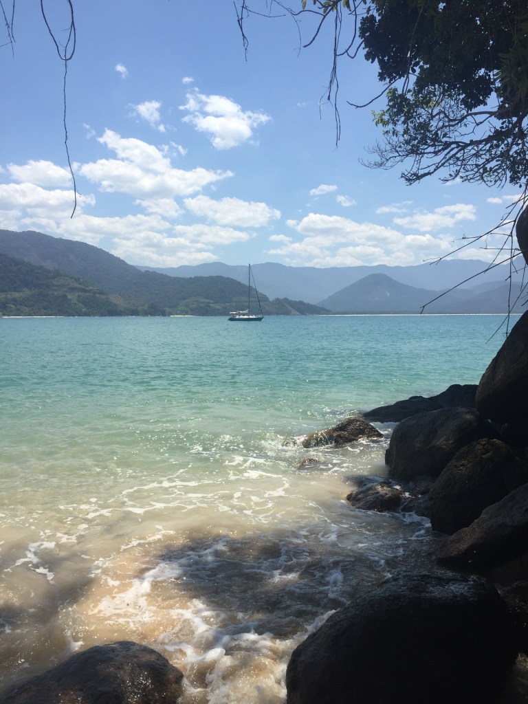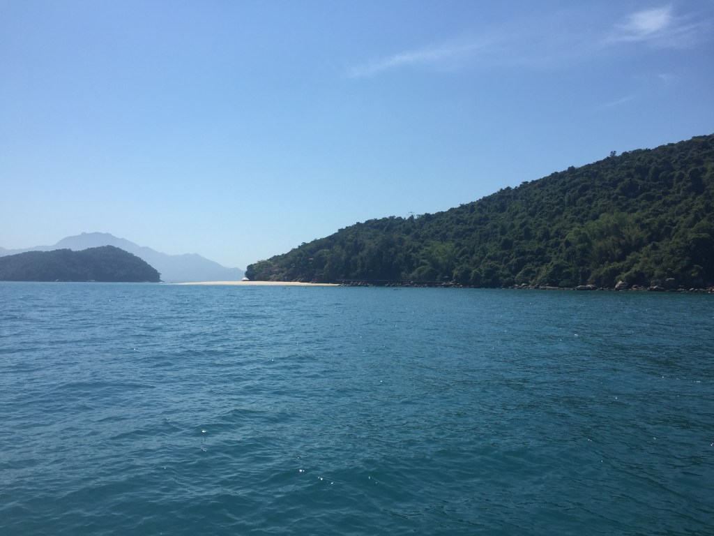 Baixei as velas e liguei o motor em busca de um lugar para fundear, mas não me encantei pela ilha: apesar de rodeada pela beleza da Serra do Mar, é uma praia sem nenhum charme, que dá direto em um costão de pedra e vegetação, com a casa dos proprietários da ilha encravada no centro e uma passarela de concreto construída ao longo das pedras, que, para mim, tirou totalmente o atrativo do lugar.