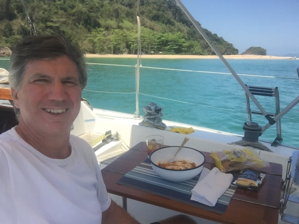 Cheguei à Ilha do Prumirim lá pelas 11 horas e, depois de ancorar, decidi fazer o almoço antes de visitar a praia. No cardápio, pene ao molho de tomate fresco, especialidade da Zabetta, que é italiana – infelizmente, meu molho nem chegou perto do dela, mas a vista da praia e da ilha de Prumirim compensou.
