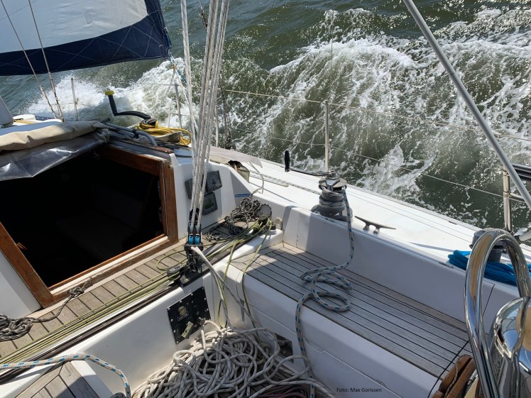 Ondas se formando com o deslocamento do casco nesta bela orçada com 20 nós de vento.
