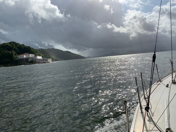 Belíssimo reflexo do sol no mar. A esquerda, Fortaleza de Santo Amaro da Barra Grande no Guarujá – SP.