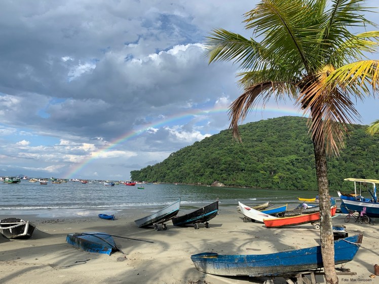 Arco-íris na praia do Perequê, maior colônia de pesca, reduto de Caiçaras e uma das mais belas baías do Guarujá – SP.