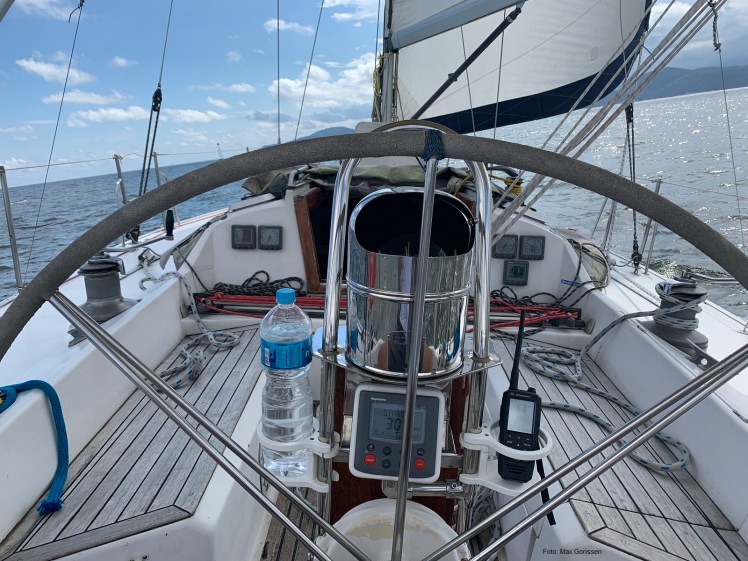 Foto tirada a partir do banco do capitão atrás da roda do leme… além da magnífica sensação de conduzir este veleiro só com a força do vento, o coração enche de alegria ao ver esta bela máquina de regata!