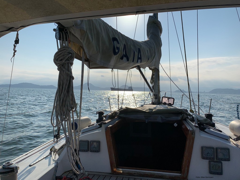 Ancorado com vista para o reflexo do raio de sol entrecortado por um navio de carga.