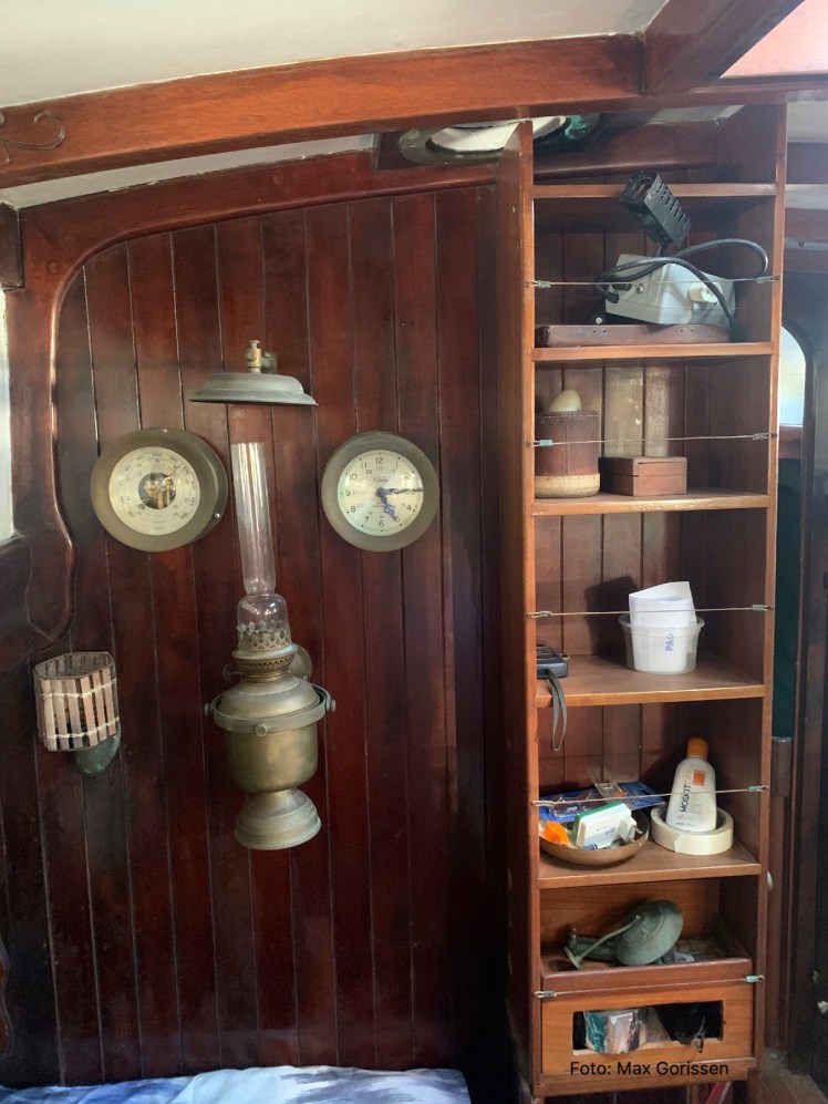 Lamparina e instrumentos instalados em uma antepara divisora em um veleiro clássico de madeira.
