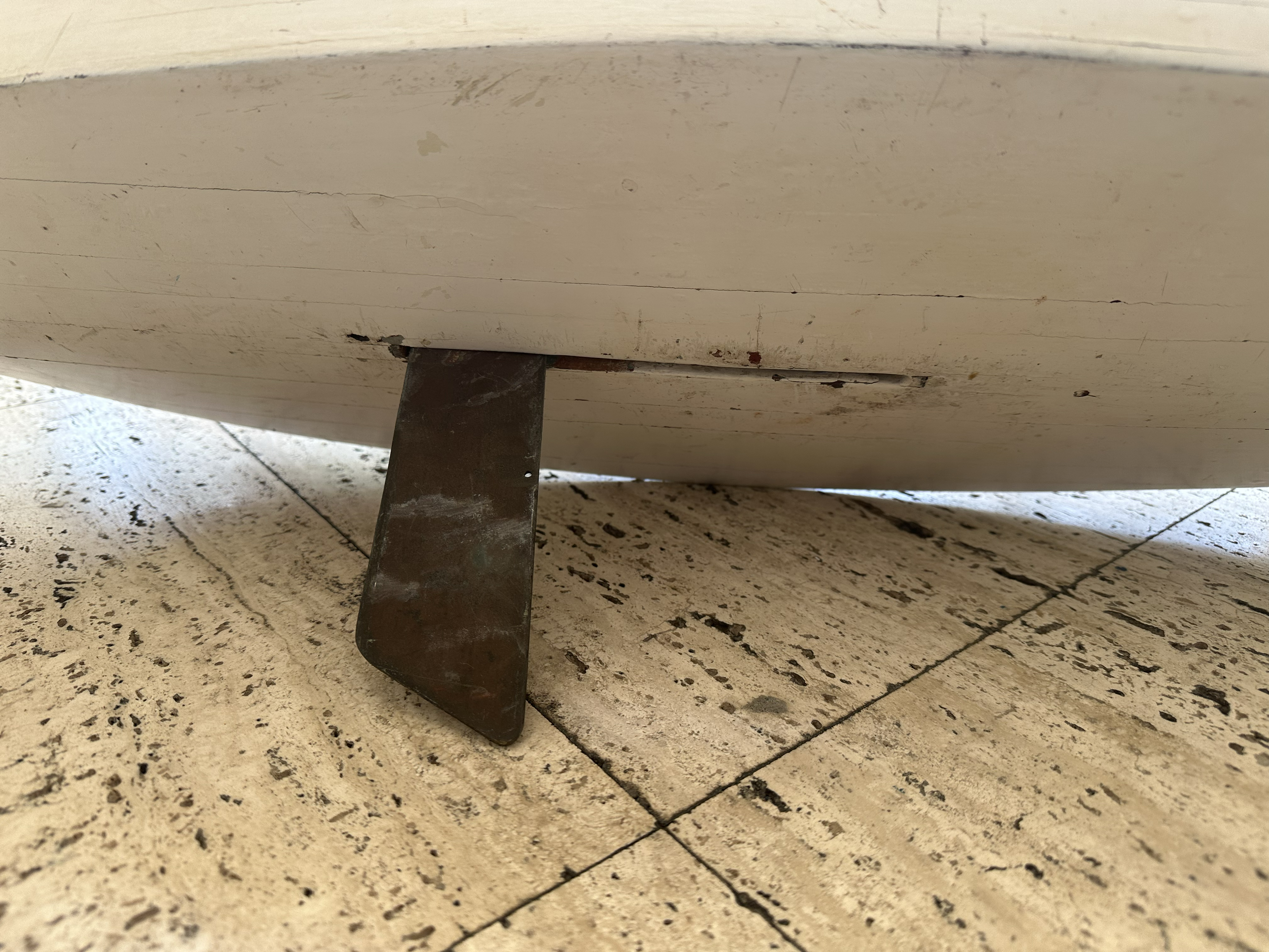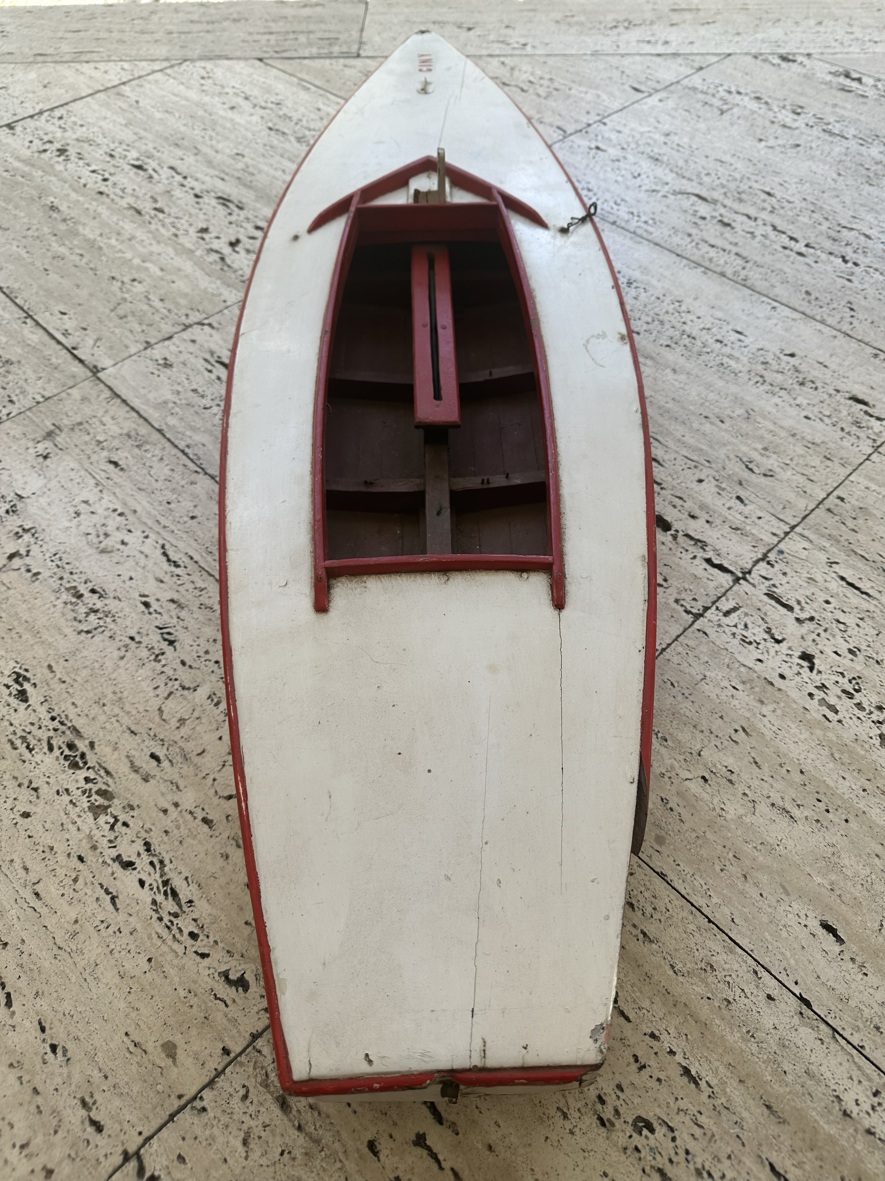 Por isso, nunca esperaria encontrar um modelo de madeira dos anos 80 de um veleiro Sharpie 12 m²… bem, foi exatamente isso que meu filho viu apoiado no travessão dos pés da mesa onde estavam distribuídas uma variedade de peças antigas como velocímetros, maçaneta para abrir vidros, volantes, logotipos, rádios AM/FM, etc. Não sei como ele viu pois os pés da mesa estavam, além de escondidos pelo tampo, atrás de um monte de outra peças maiores como calotas, para-choques e tampas de cabeçotes.