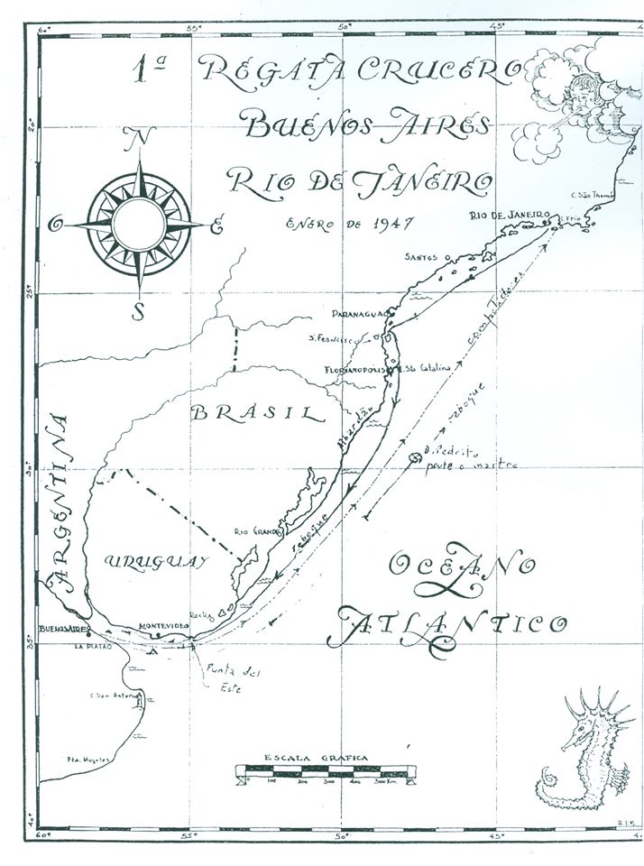 Participou em 1947 da Buenos Aires – Rio de Janeiro (DNF) onde, no dia 10 de janeiro, quebrou o mastro no través de Tramandaí – RS e foi rebocado pelo navio Grajaú da Marinha do Brasil para Florianópolis – SC. Tripulação nessa regata: Gustavo Eugênio de Oliveira Borges (Comandante), Alberto Niquet, Franz F. Schwlbe e Benevuto Cardu. Fotos: Autores não identificados. Se souber quem é o autor de alguma foto, favor entrar em contato para darmos a devida autoria.