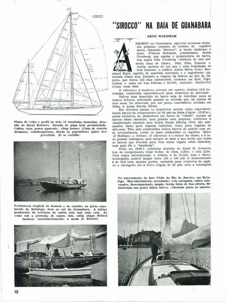 - Observações: Projetado para construção em serie da chamada 10 Ton Class. O SIROCCO não existe mais, tendo sido vendido para um tal de “Sr. Luiz”, que vivia no Guarujá, teve seu lastro e ferragens removidos e, em seguida (ano incerto), acabou seus dias largado num mangue, próximo ao ICS. O Sirocco foi matéria da Revista Yachting Brasileiro em 1948.